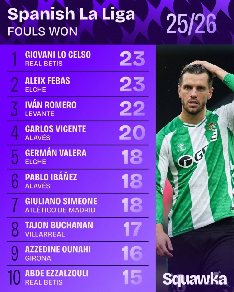 10月7日讯 日前,Squawka统计了本赛季西甲被犯规次数排行,洛塞尔索23次居首,朱利亚诺-西蒙尼18次并列第五。