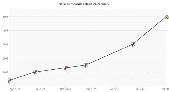 马斯坦托诺今夏从河床以4500万欧的转会费加盟皇马,他此前身价3000万欧,本赛季至今,马斯坦托诺为皇马出战8场比赛,贡献1粒进球。